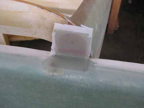 In the mean time I've drilled out the holes in the alignment tabs to 1/4 inch and floxed in the bushings and drilled out the holes in the lift tabs and through the F-22 bulkhead to 1/4 inch for AN4 sized bolts. The holes in F-22 will eventually be drilled out to 5/8ths to accommodate a bushing that will be installed later in Chapter 13. The photos below show the fabrication of a filler piece to help close up the gap between the bottom of the canard and the fuselage and floxing the top of the fuselage sidewall and up the F-28 bulkhead and covering with one ply of BID, (the alignment pins were not floxed in at this point).