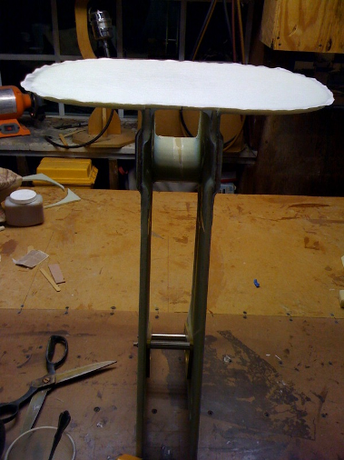 The nose gear strut will be cutout with a box knife after a few hours of cure when the glass hardens to the chewing gum stage.