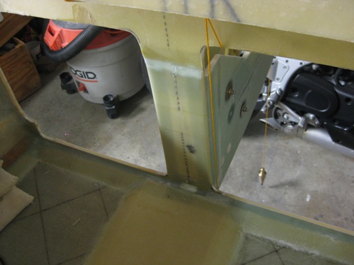 So no more excuses it's time to bond the nose structure to the fuselage, the critical thing of course is to make sure; it's bonded on the fuselage centerline, is vertical and level. To do this I put the main gear back on and re-leveled everything. Then I needed to mark the fuselage centerline on the garage floor and extend it forward beyond F-0. I hung a plumb bob from the firewall and F-22 centerlines and marked the floor. I then 5 minute epoxied nails to the floor in line with the marks to stretch a string. I marked a line along the string and with a straight edge extended it forward beyond F-0.