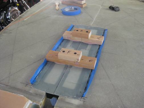Now the challenge is of course to attach the doors to the hinges, the hinges to the opening and have the bolt holes line up and the doors flush with the bottom of the fuselage. I matched drilled holes in one half of each hinge with the plywood strips with the aluminum slogs and threaded the slugs for screws. Then I floxed the doors to the hinges and after cure riveted them with flush head rivets. Then I assembled the hinges so the doors are hinged to the plywood strips. I bondoed the doors together with strips of wood and then cut the strip of wood at the center line and screwed another block of wood on top, I couldn't get the assembly in the hole otherwise. Then I floxed the wood strips into recess in the hole cutout and held them in place with spreader clamps. I did remember to fill the back of the screw holes with wax. After that cured I unscrewed the door/hinge assembly from the plywood strips which are now permanently floxed in place, filled the holes completely with wax and floxed the corners and laid up 2 plies of BID around the opening including over the plywood strips.