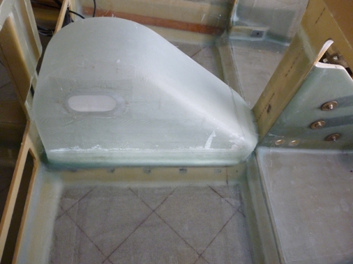 The joggle at the F22 bulkhead is smoothed out with some foam and then the floor is glassed with two plies of bid overlapping onto the NG-30's, F-0's and onto the fuselaged floor by 3.5 inches. another ply of bid 5 inches wide is placed over the joggle for abrasion purposes when the pilot's and copilots feet are slid over the joggle when getting in. A 1.5 inch foam border is left unglassed to make rounding the bottom and side corner easier.