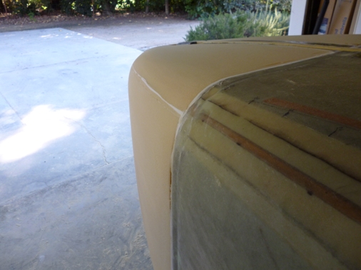 After a few hours of grinding all the joints as smooth as possible we covered the bottom of the nose section with 2 plies of BID and a third 8 inch wide ply down the middle. The second ply is cut an inch shorter that the first (reason for the lines) to avoid a bump when overlapping the glass from the upper section.