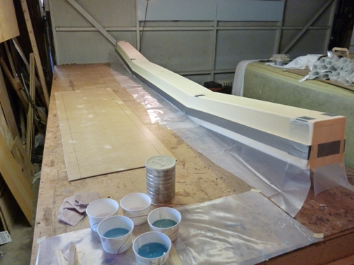 Here are some pictures of the bottom spar layup. This time I put some flox in the corner of the dam to keep the epoxy from running down.