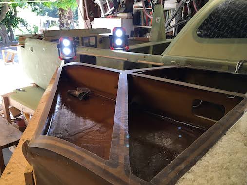 Then each sump gets 4 plies of BID. The second picture is the inside of the sumps with a heavy coat of epoxy and a ply of deck cloth to seal them.