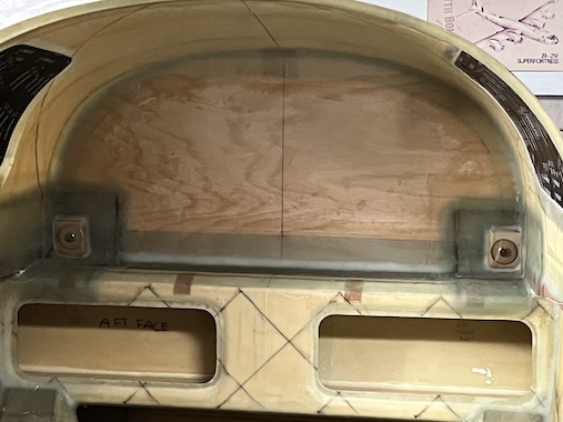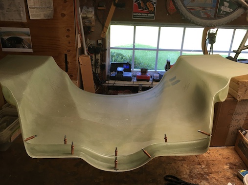 The upper cowl gets a stiffening rib floxed in near the trailing end of the cowl, held in place with cleco's. The flanges over the turtleback and lower corners were done (except for the additional four plies along the inside) so it was time to bolt on the wings to fabricate the flanges along the wing roots and center spar.