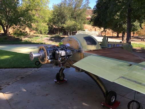 Some more pictures before removing the wings and putting the plane back in the garage. Note the kettle bell strapped to the nose gear, that, along with another 100 lbs loaded in the footwell area of the fuselage keep the plane from tipping over onto it's tail due to the engine weight.