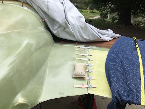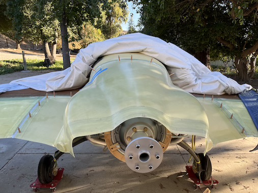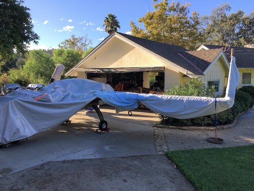 Not enough room in the garage with the wings on so had to keep the airplane outside while doing the wing and center spar flanges. Found some old car covers and sheets to protect it from the sun. The UPS driver asked if I would fly it out from the backyard.