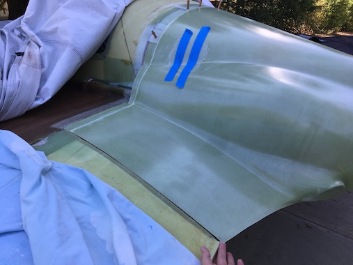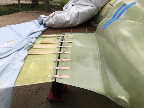 Here the outboard edges of the cowl are bondo'd to the wing root with popsicle sticks to keep the edges aligned. The underside of the cowl has duct tape so the flange is only glassed to the wing root under side. For some reason the left side of the cowl was about a 1/2" short so the flange was made a little wider to make up the gap.
